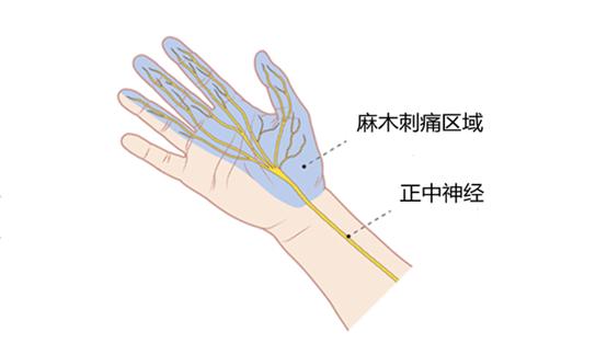 方法一:在腕横韧带近侧缘处,用手指叩击正中神经(见下图),拇指、食指、中指会出现放射痛。
