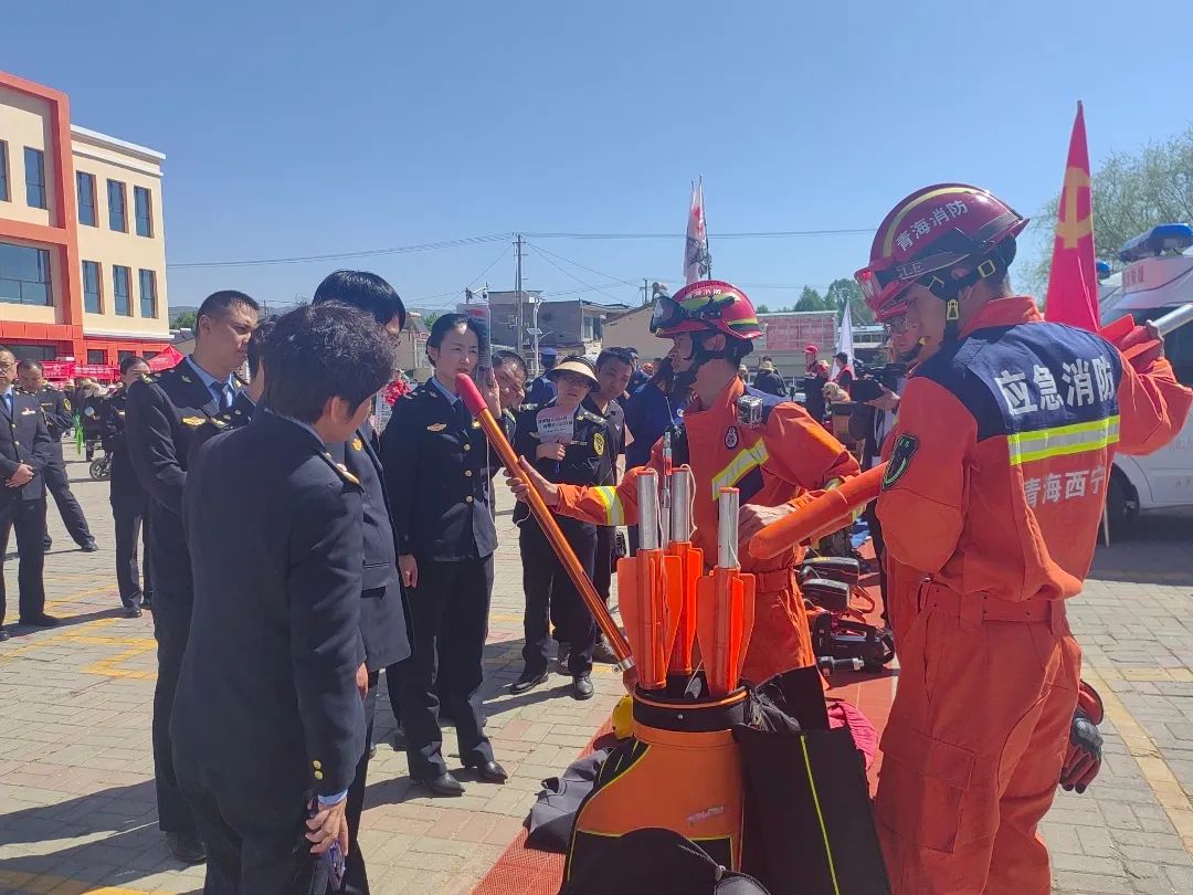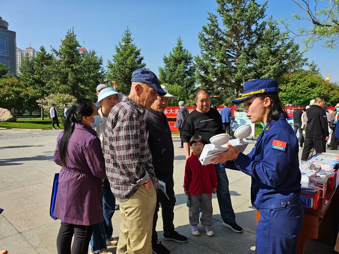 湟中区消防救援大队结合夏季防火工作,向群众详细介绍家庭安全用火、用电、用气常识、火灾发生时如何逃生自救以及严禁占用消防车通道、楼内存放电动车和充电等安全常识,并发放各类宣传手册。在器材展示区,消防救援人员现场讲解各类器材的使用范围和方法,并现场展示装备器材。