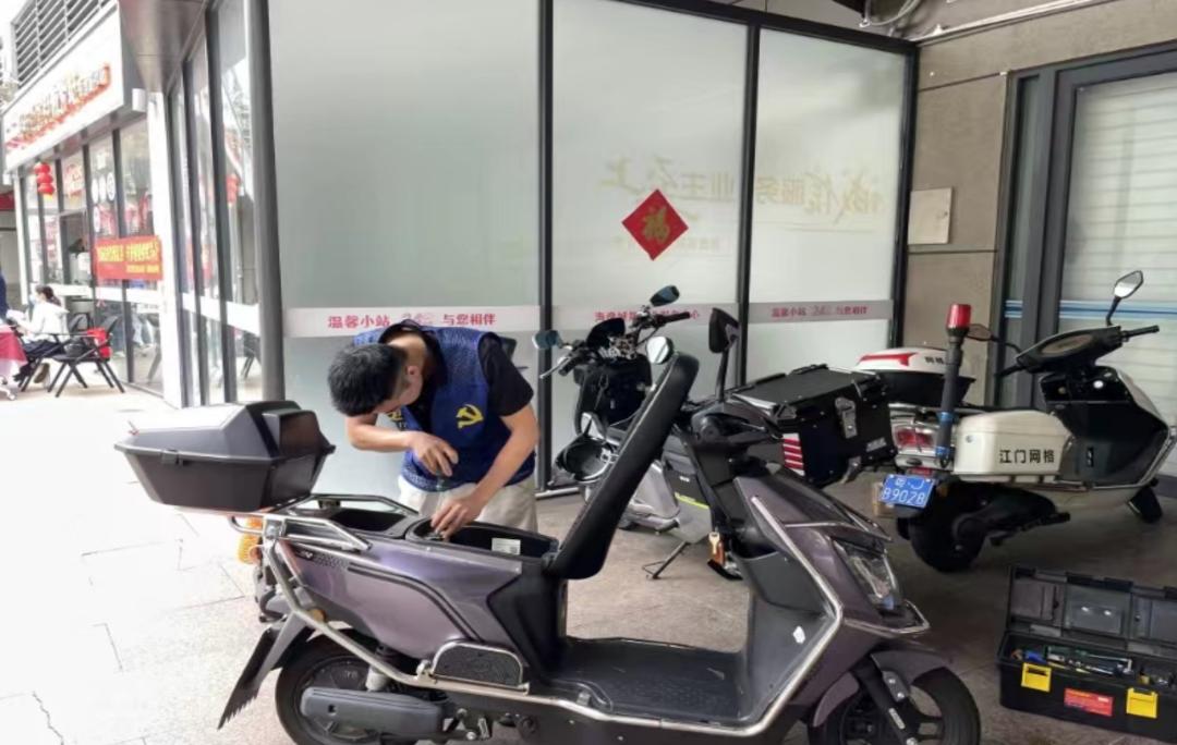 近日,在“蓬友+”党群服务站(海逸城邦站),篁庄社区联动侨乡行新业态事业管理服务有限公司党支部开展志愿日活动,为周边居民提供义诊义修等服务。讲解电动车常见故障,普及日常保养方法,检修蓄电池、刹车器、轮胎……侨乡行党员们带上工具,为外卖骑手、快递小哥和周边居民“保驾护航”。