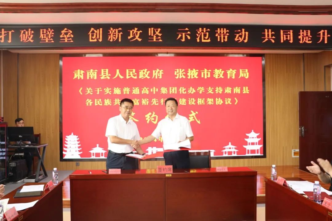 考察组一行先后观摩了张掖中学文化广场、木塔书院、科技馆、餐厅、心理健康教育中心等地,详细了解了学校教育教学、文化建设、科技创新、学生生活、心理健康等方面的成果和特色。在随后召开的座谈会上,县委副书记、县长钟向辉通报了肃南县和张掖中学合作办学成果情况,并与张掖市教育局党组书记、局长杨城代表双方签订《关于实施普通高中集团化办学支持肃南县各民族共同富裕先行区建设框架协议》,张掖中学、肃南一中负责人分别介绍了学校办学情况。