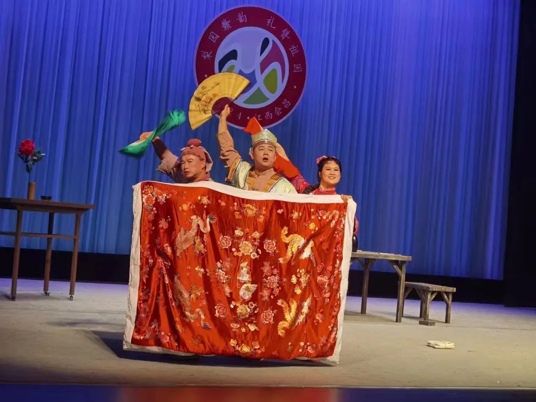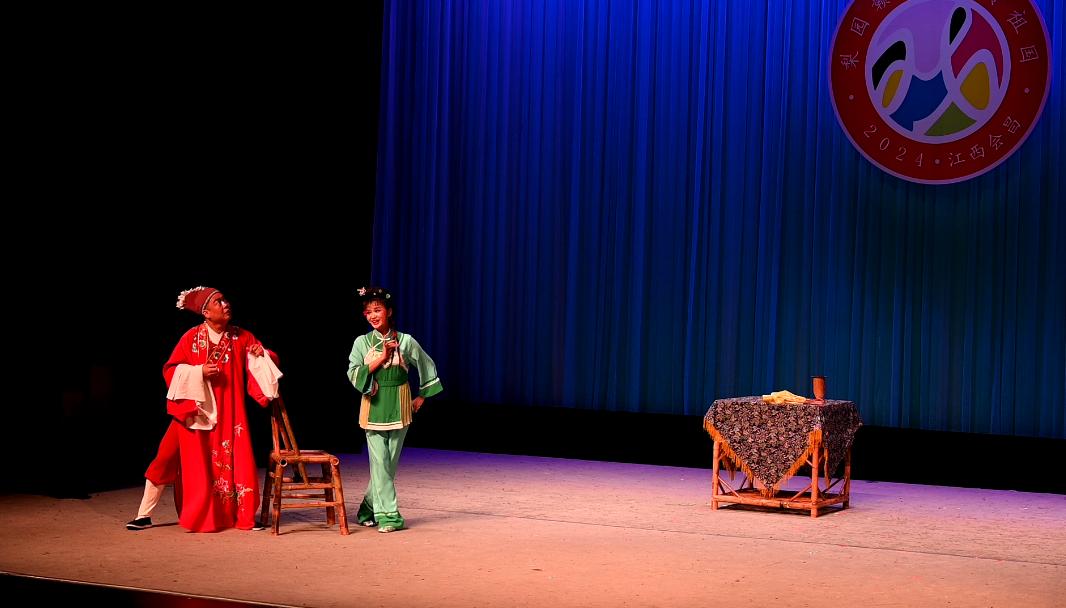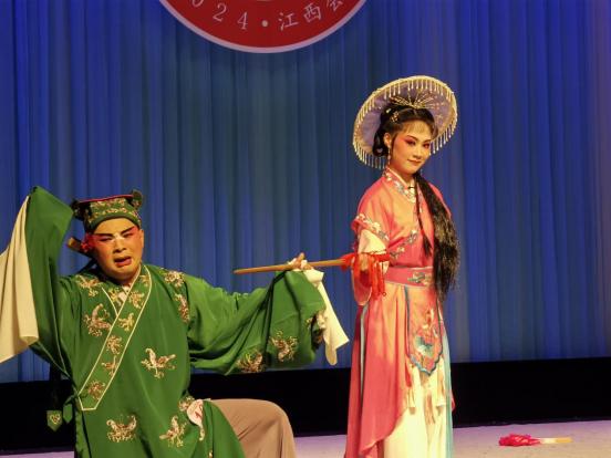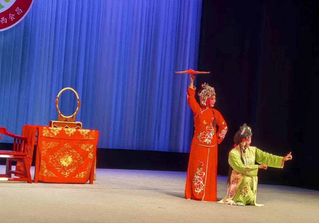 △南昌采茶戏《银心摆酒》展演现场,富有属地特色的赣剧、京剧、东河戏、西河戏、赣南采茶戏、抚州采茶戏、黄梅戏等多种戏曲剧种的经典唱段以及美声歌曲,充分展示着江西戏曲艺术的多样性和独特魅力。同时,青年戏曲演员们通过不断创新表演形式和生动的舞台表现,使传统经典剧目与现当代新编优秀剧目交相辉映,为戏曲注入新的活力。