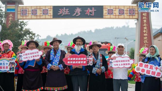 7月9日,青海省海东市互助土族自治县五十镇班彦村村民在村口迎接环湖赛车队的到来。新华网 潘彬彬 摄