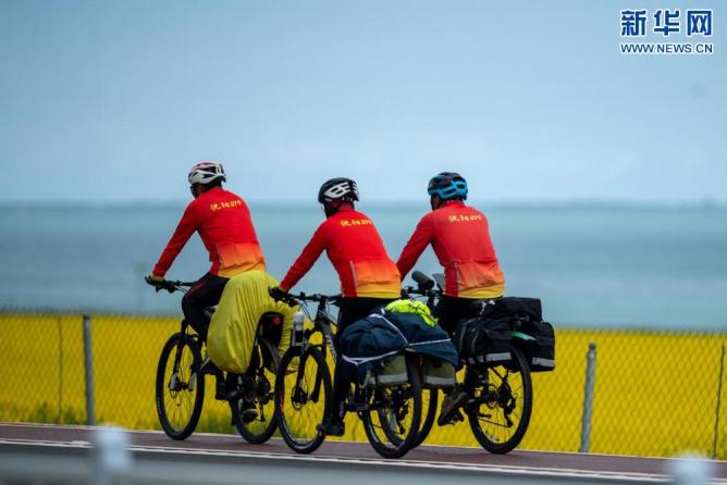 7月11日,自行车爱好者在青海湖畔骑行。新华网 潘彬彬 摄