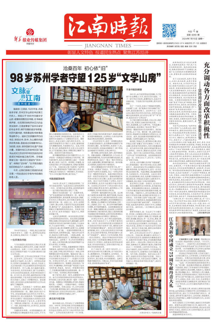 如今,文学山房已经125岁了,我也到了白寿之年。回首往事,那些藏书人家的大门、门厅仍然历历在目:陆润庠的书箱堆成亚字形,仪鄦庐的书房像个密室,阿英收集的晚清画报、期刊……我还记得,夕阳在平江路上斜照时,我捧着古书,踏着青石板路,向藏书楼走去……不同时期,人和书有不同命运。现在这个新时代,就是个好时代,今天流通的书籍,只要是好书,就能得到大家的重视、爱惜。当代书林,光焰愈炽。我活过这么多个时代,深感现在的生活最平安幸福。书因人聚,有爱书的人在,书香文脉就不会断绝。我的最大心愿就是传承中国文化遗产,直到生命的最后一息。