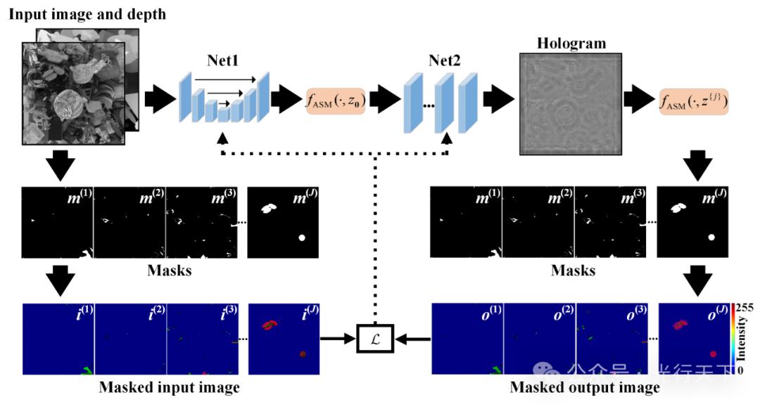所提卷积神经网络的训练流程图如图2所示。训练过程中,网络输入包含三维场景信息的强度图和深度图到Net1进行编码,Net1由Unet架构实现并输出目标振幅和相位场。使用角谱算法将目标振幅和相位场向前传播z0,得到全息平面的振幅和相位场。之后,将全息平面的振幅和相位场输入Net2并生成全息图,Net2由一个全卷积残差网络实现。使用角谱算法将全息图随机重建到三维物体的一层,计算并最小化重建图像与目标图像的损失。通过反向传播更新Net1和Net2的参数。训练中使用了由均方误差损失和感知损失组成的复合损失函数。