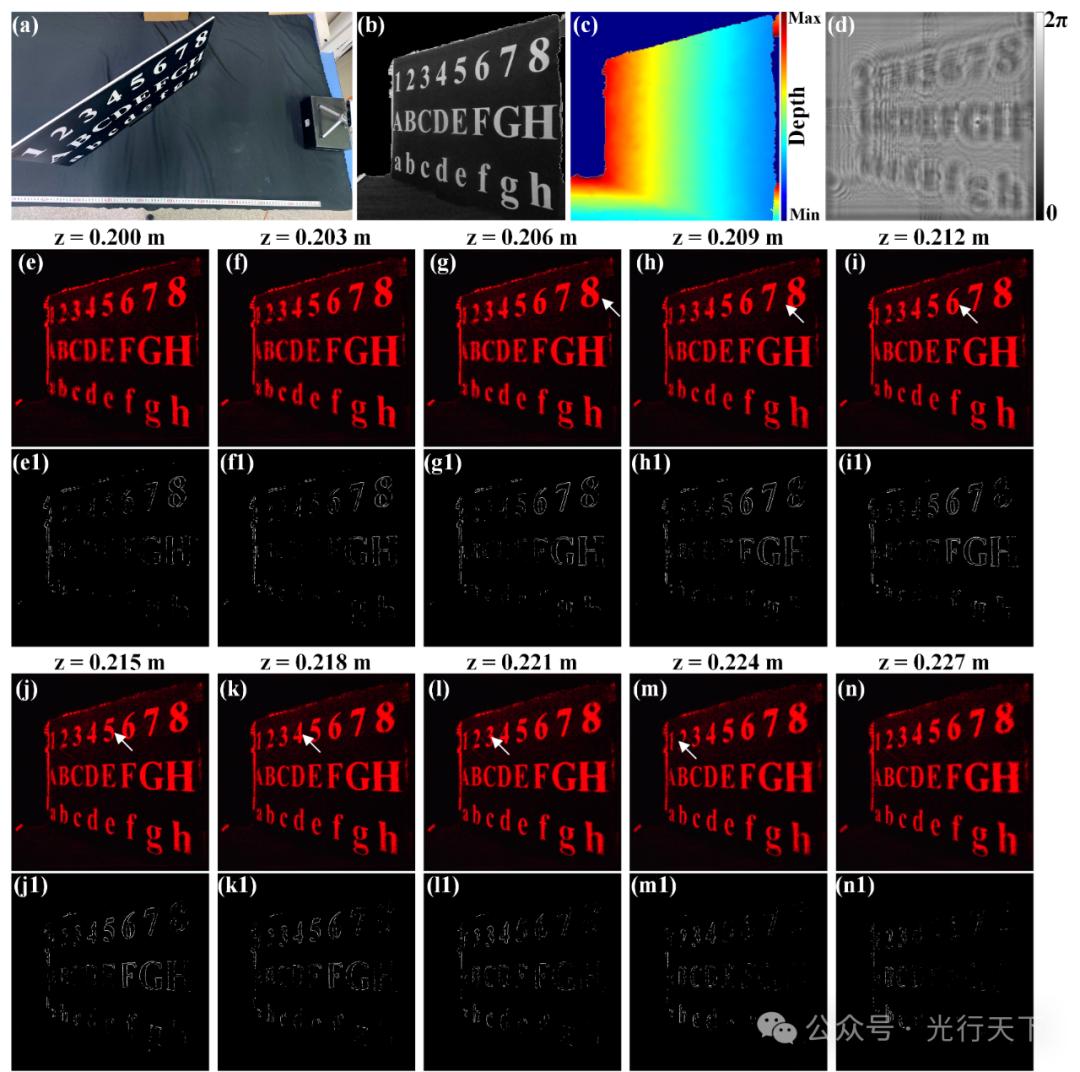 图4为三维实景采集与光学重建结果。可以看到,三维物体的细节得到了很好的重建,在焦区域附近可以观察到相对清晰的画面,光学重建结果和数值重建结果较吻合。为了更加直观地展示重建图像的在焦区域随重建深度的变化,使用Tenengrad算子提取重建图像的在焦区域如图4(e1)-(n1)所示。随着重建距离的增大,提取出的在焦区域逐渐由三维物体的近端向远端移动。实验结果证明了所提方法对于不同深度物体的重建能力。