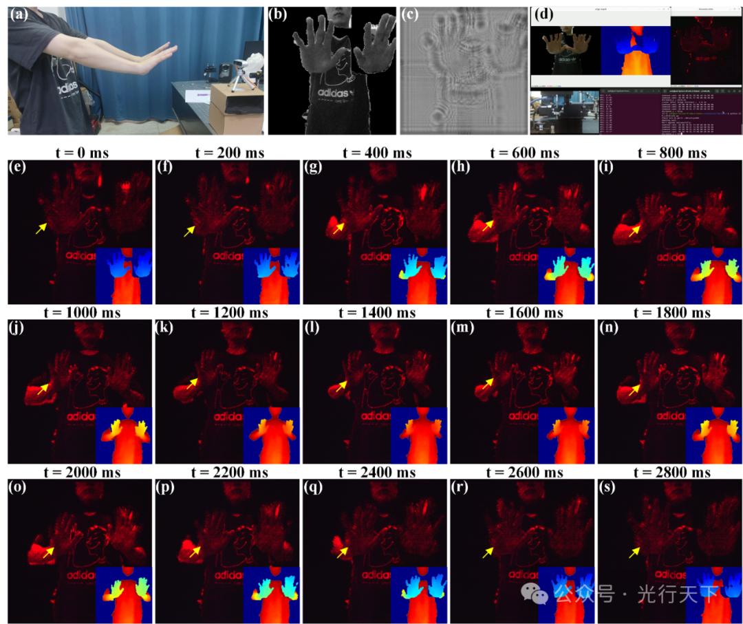研究团队进一步验证了所提系统对运动的人体的三维采集与重建效果如图5所示。CCD相机拍摄三维场景远端的全息重建图像。可以看到由于人体躯干部分位于远端并保持不动,因此人的衣服的图案始终清晰。在t = 0 ms时,人的手部距离深度相机较近,图5(e)中黄色箭头指示的手部呈现出离焦模糊的效果。随着手部逐渐远离深度相机,手部的全息重建图像逐渐清晰。在t = 1400 ms时,手部移动到最远端,手部的全息重建图像呈现出最清晰的效果。从t = 1600 ms开始,手部开始接近相机,随着时间的推移,手部的全息重建图像逐渐模糊。