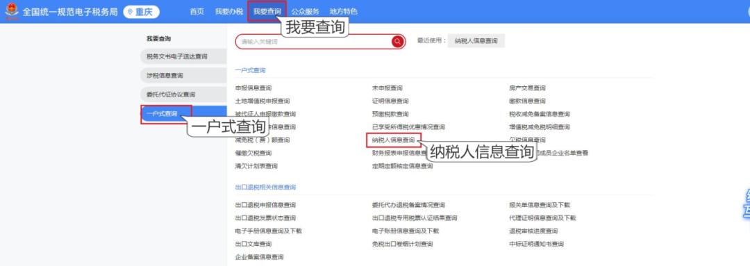 1.在首页依次点击【我要查询】-【一户式查询】-【纳税人信息查询】,进入功能页面。
