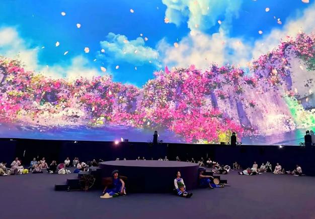 “天瀑灵韵演出厅是直径30米的巨型球幕剧场,是全国首个最大的户外穹顶天幕,现场具备全国三分之一省剧院同款音效配置、全球顶级穹顶投影裸眼3D显示、全国首个AIGC打造的大型数字内容空间,演出结合当地的布依族少数民族文化歌舞,通过声光电演绎和演员的完美配合,给予游客沉浸式的感官体验。”天瀑灵韵光影艺术演出现场负责人范德俊介绍道。