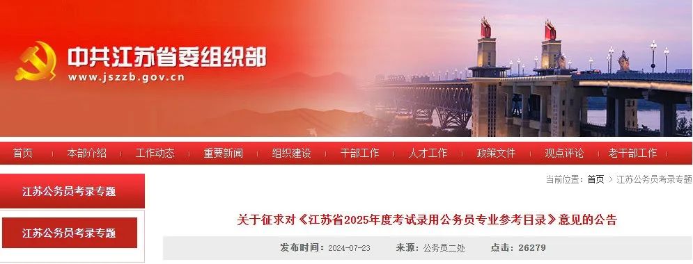为提升我省考录工作科学化水平,进一步完善《江苏省2025年度考试录用公务员专业参考目录》,更好地为招录单位规范设置、审核职位专业条件提供依据,为广大考生选报职位提供参考,现决定向社会公开征求对《江苏省2025年度考试录用公务员专业参考目录》的意见和建议。