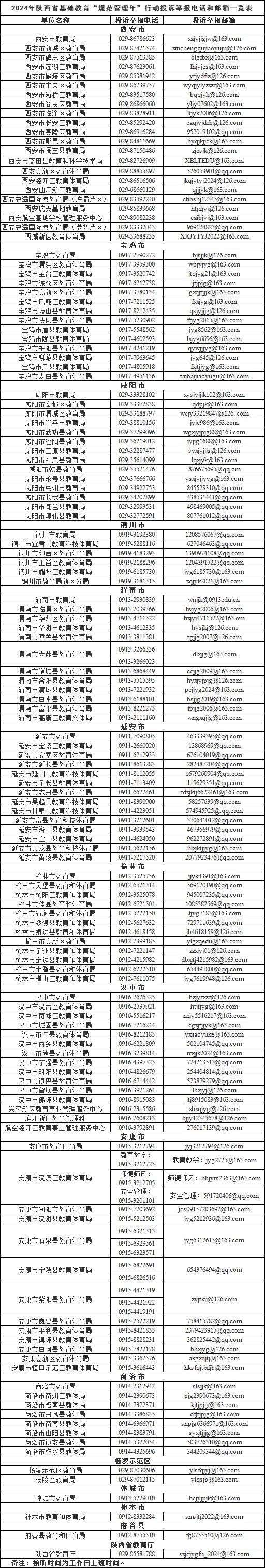 2024年陕西省基础教育“规范管理年”行动投诉举报电话和邮箱一览表