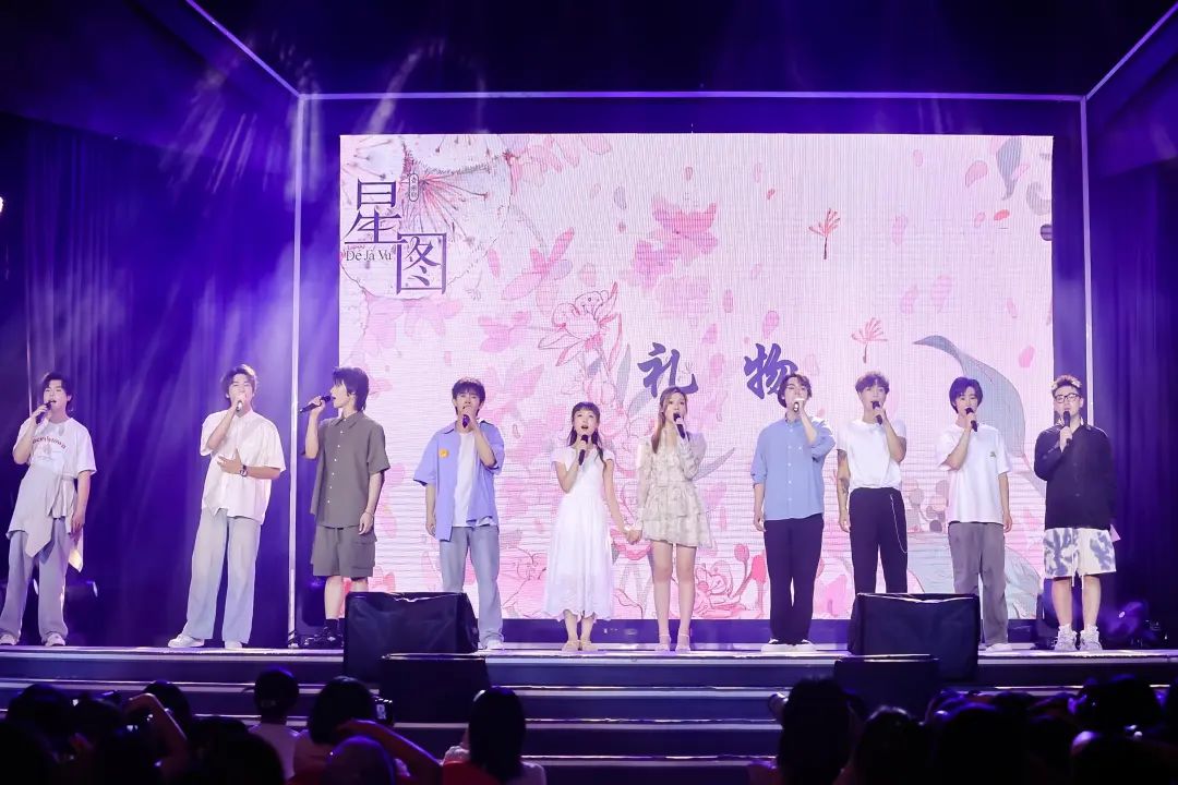 而在大世界戏剧派现场,尹智博、张智涵等10位卡司先后上台,与剧迷近距离互动。他们畅聊创排过程,揭秘排练幕后趣事,还特别呈现了剧目的部分歌曲,让现场观众们提前体验到了音乐剧《星图》的魅力。从游戏挑战,到幕后创作解析,这场“大世界戏剧派”既有趣味互动,又传达了音乐剧作品的文化内涵的更深刻思考。