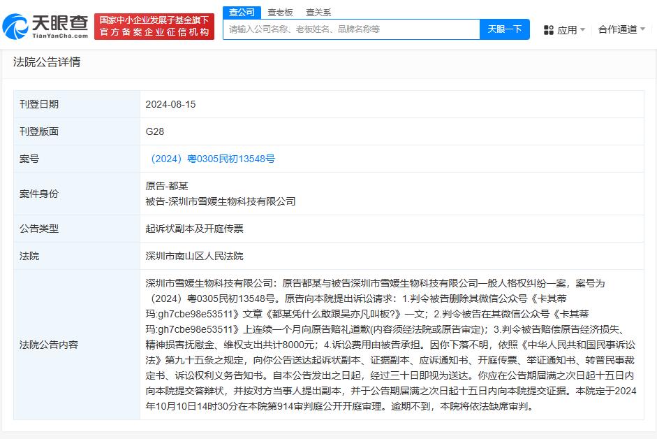 天眼查法律诉讼信息显示,近日,深圳市南山区人民法院向被告深圳市雪媛生物科技有限公司公告送达原告都美竹与其人格权纠纷案件起诉状副本及开庭传票。