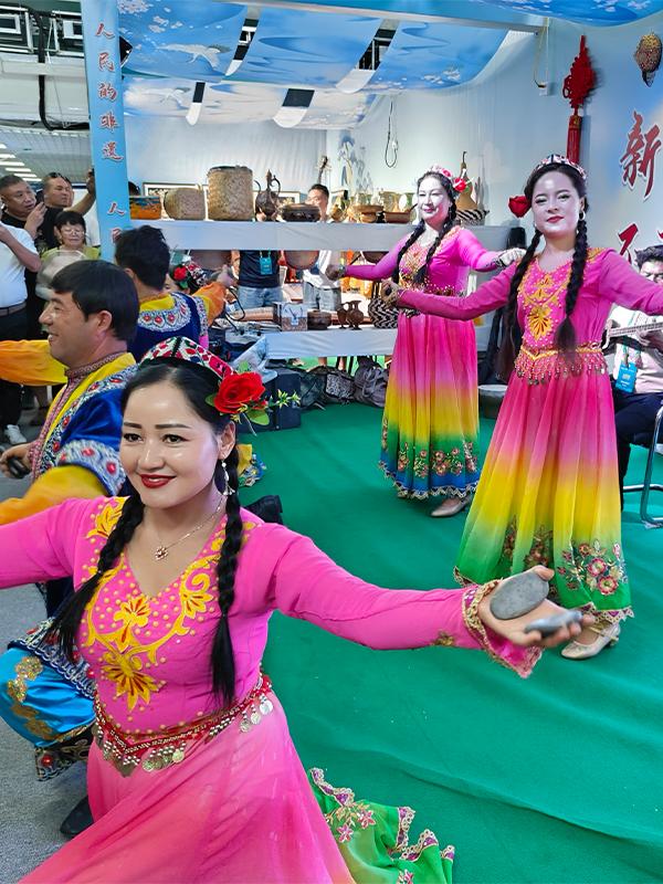 在静态展示之余,非遗歌舞的加入更是为这场文化盛宴增添了别样的色彩。身着鲜艳服饰的演员们载歌载舞,欢快的旋律与灵动的舞姿交织成一幅幅生动的画面,展现了丰富多彩的中华优秀传统文化。从传统戏剧秦腔到民族传统舞蹈,再到塔吉克族的鹰舞,每一声唱腔、每一次起舞、每一段演奏,都蕴含着深厚的历史内涵和中华大家庭深入的交往交流交融,让现场观众仿佛置身于一场盛大的文化盛宴之中。