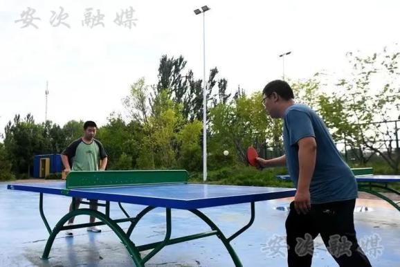 在廊坊市安次区龙河中央公园,市民在打乒乓球。(韩沙沙 摄)