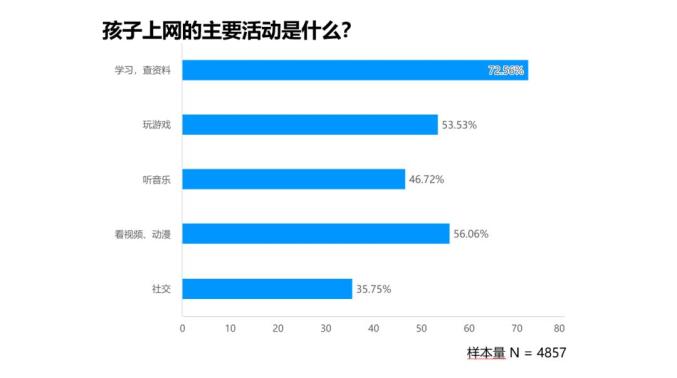 1.未成年网民上网最常做的3件事是:学习(72.56%)、看视频(56.06%)、玩游戏(53.53%)。