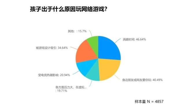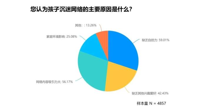 2. 未成年人玩家沉迷网游的原因依次是:缺乏自控力(59.01%)、网游内容吸引力大(56.17%)、缺乏其他兴趣爱好(42.43%),还有25.08%的认为是受家庭环境影响。