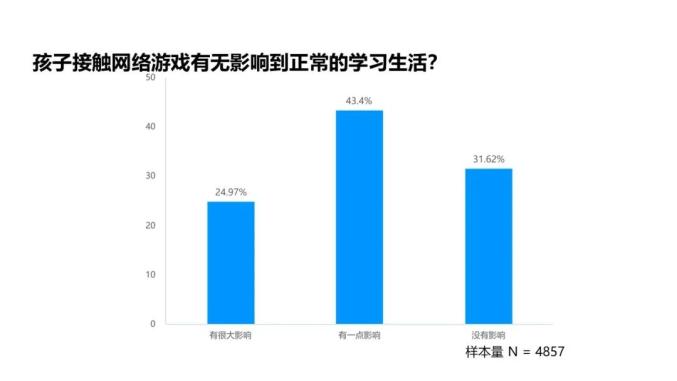3. 24.97%的家长认为网游对孩子正常的学习生活有很大影响,多数家长(43.4%)认为有一点影响。