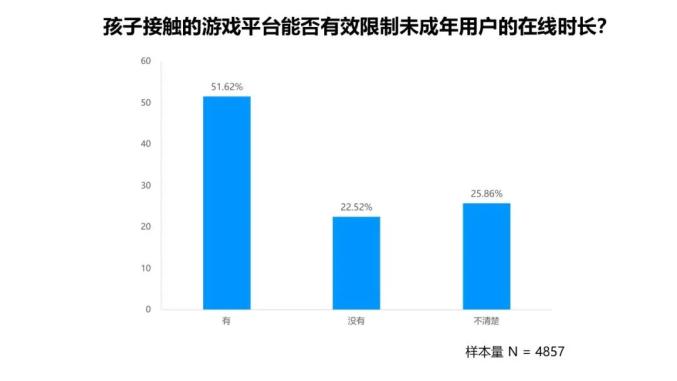 2. 51.62%的家长认为网游平台可有效限制未成年玩家的在线时长,22.52%的认为不起作用。