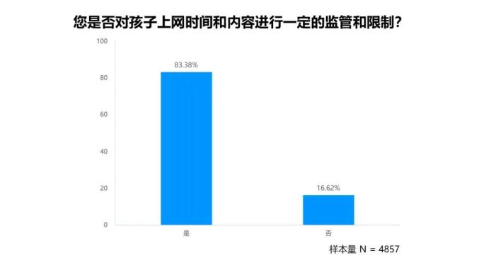 1. 绝大部分家长(83.38%)会对孩子上网时间和内容进行一定监管和限制。