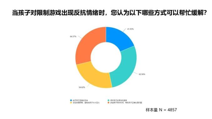2. 当孩子对监管出现反抗情绪时,家长常用的纾解方式是:多些亲子陪伴时间(64.37%)、倾听孩子的想法和感受(62.56%)、设定合理预期,避免给孩子太大压力(54.62%)。