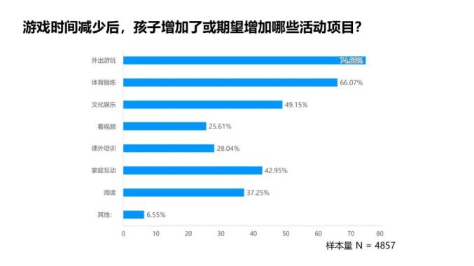 3. 游戏时间减少后,孩子最希望增加的活动项目依次是:外出游玩(74.68%)、体育锻炼(66.07%)。