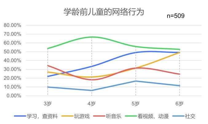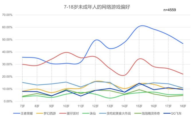 当代未成年人与网络相伴而生,智能音箱、智能电视、智能手机使其数字化生活程度比父辈们都高。数据显示,有509名学龄前儿童已经开始使用互联网,触网时间“低龄化”明显。其中,看视频和动漫的比例远高于其他年龄段,上网学习的比例逐年提高。从小学阶段开始,以王者荣耀和蛋仔派对为代表的手游玩家比例,远高于以梦幻西游为代表的传统端游,其中,王者荣耀玩家数随年龄增长而波动上升,蛋仔派对玩家数随年龄增长而波动下降。