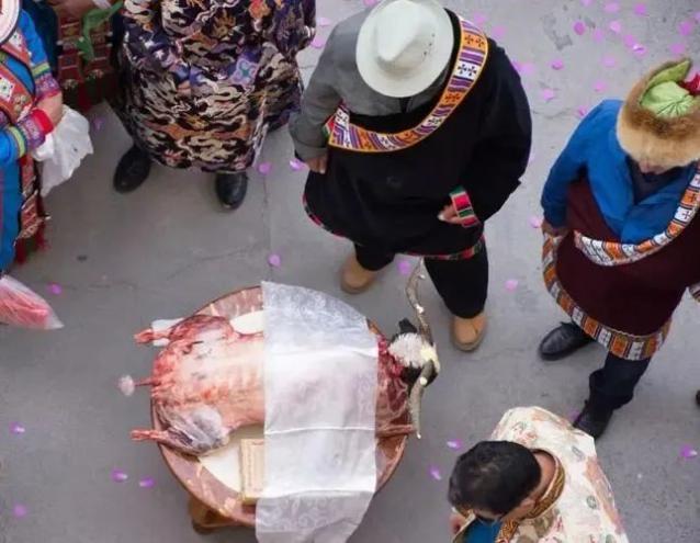 献羊背是按照前来参加婚礼客人的身份、辈分,把一只羊分成十二份羊背子,敬献给客人。客人进门时,给新郎家人献哈达,新郎家献羊背时,回献哈达。同时,根据客人身份,有说者给每人献一段说词。这时,喜宴便开始了。当酒兴正浓时,双方歌手开始对唱,对唱一直延续到深夜方才散去。