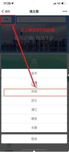 2、左上角选择“东阳”区域,即可进入东阳信义居智慧物业。