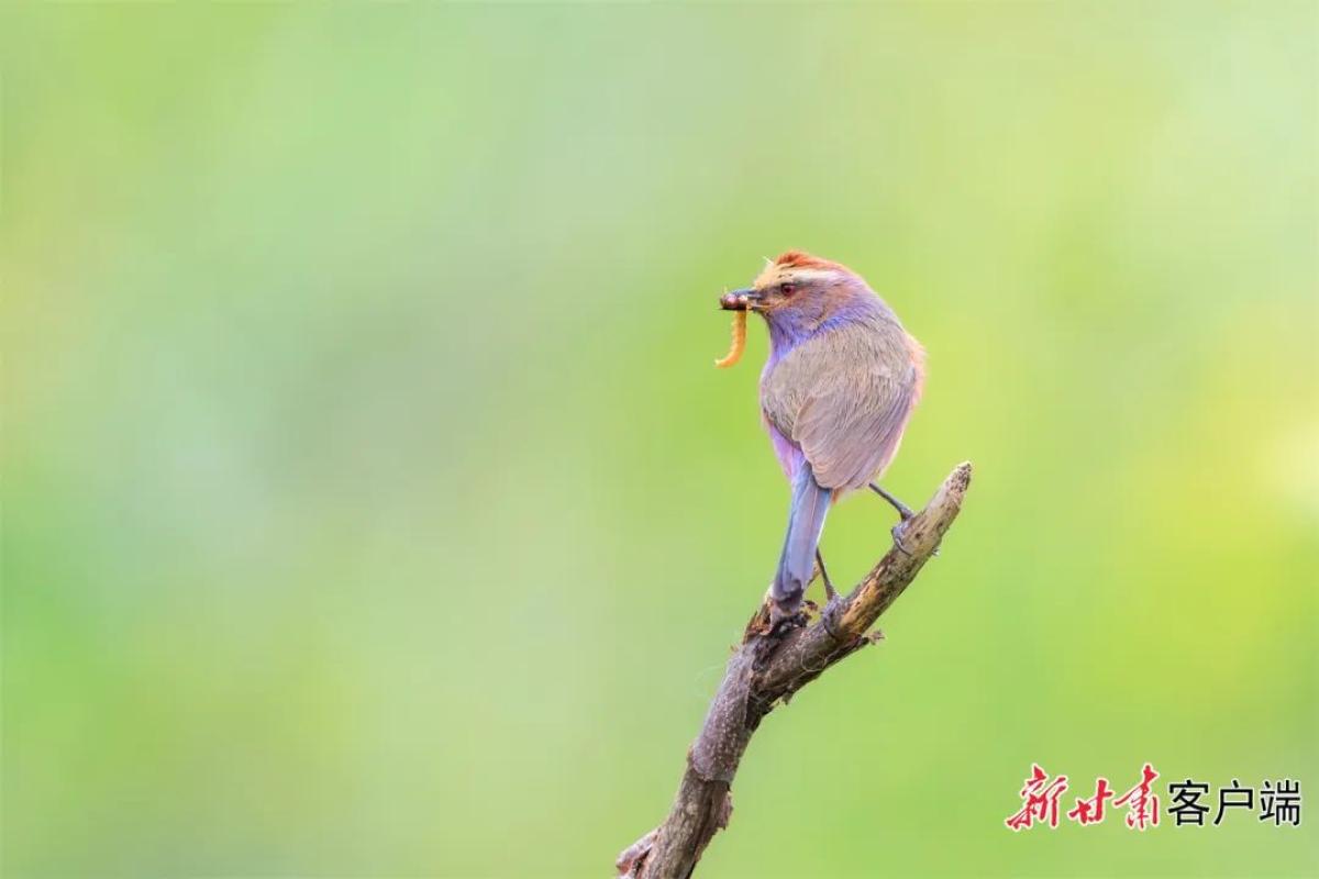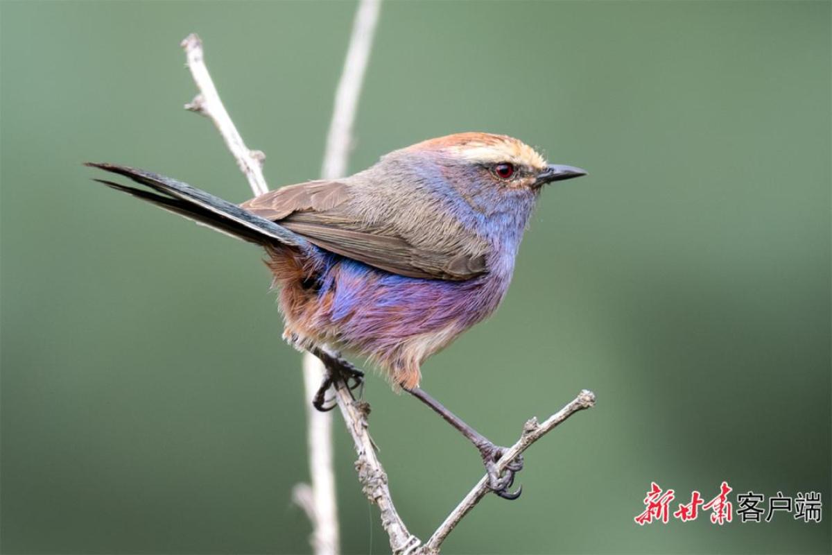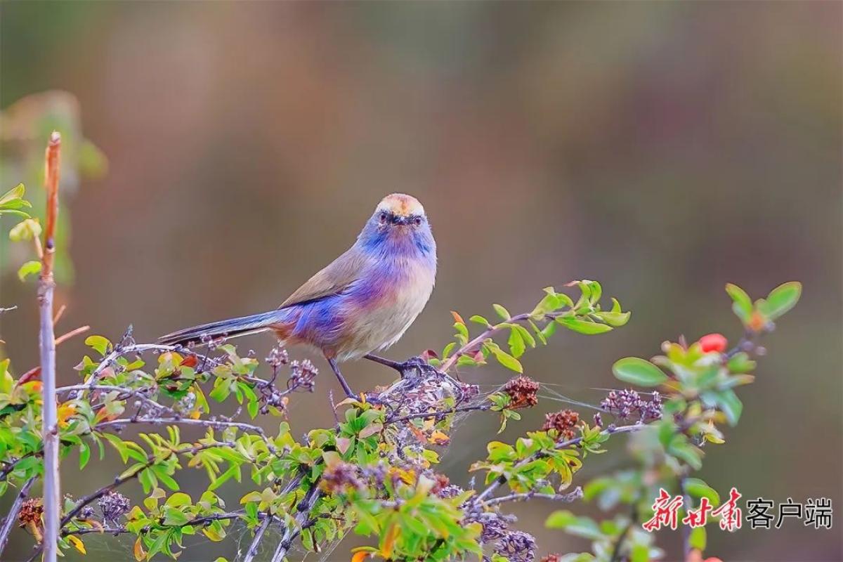 据了解,花彩雀莺是一种毛茸茸偏紫色的雀莺。顶冠棕色,眉纹白。尾长,羽毛松软。前额有一宽阔的眉纹淡黄色,头顶栗色或棕红色,有的具紫蓝色光泽。背灰色,腰和尾上覆羽辉紫蓝色,飞羽灰褐色。种群数量趋势稳定,因此被评价为无生存危机的物种。列入《世界自然保护联盟濒危物种红色名录》。(新甘肃·甘肃日报记者 徐俊勇 通讯员 华亮 焦方宁)