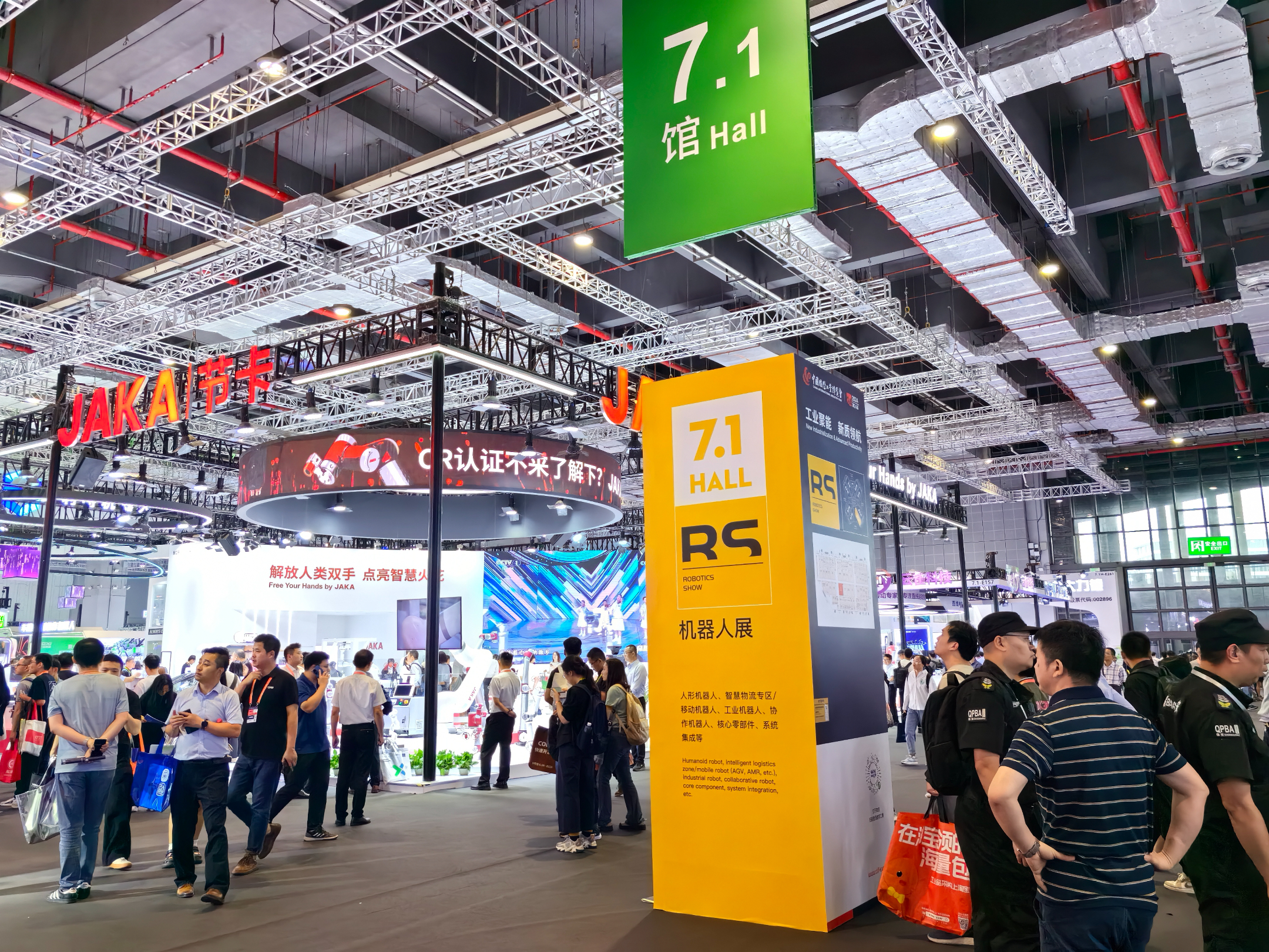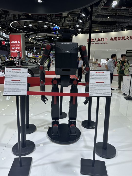 JAKA K-1人形机器人此次也面向全球首发首展。这款机器人高1.8米,全身具有29个活动关节,双臂有14个自由度,能够完成各种复杂的人类动作。JAKA K-1在现场向观众挥手致意,吸引不少人驻足。