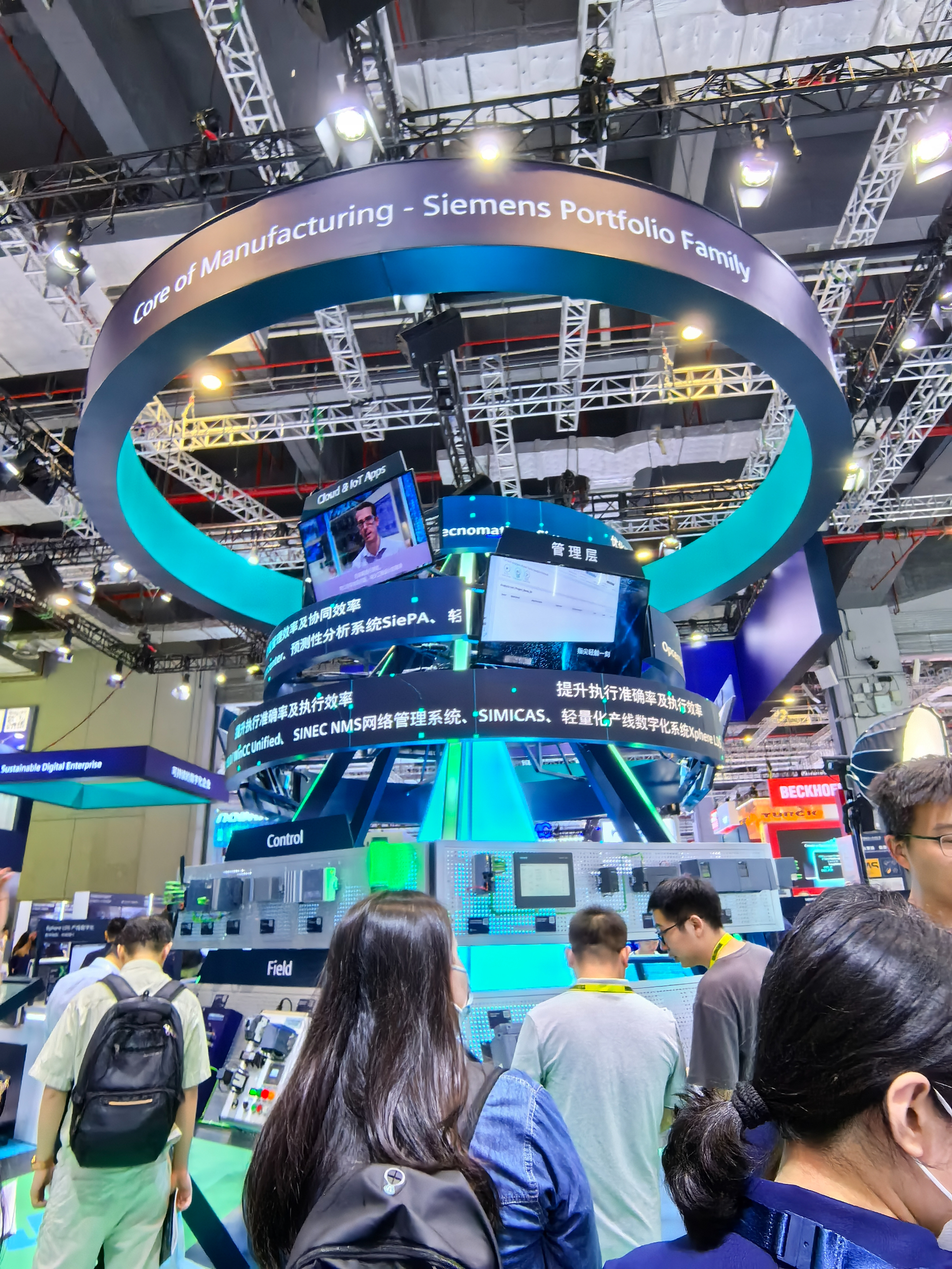 工博会“老朋友”西门子再次亮相,今年展台的中央屹立着一座塔状的旋转展柜,将几十种工业自动化领域的软硬件产品分门别类,归于现场层、控制层、操作层、云端和物联网应用等圈层,首次全景展示其核心产品家族。