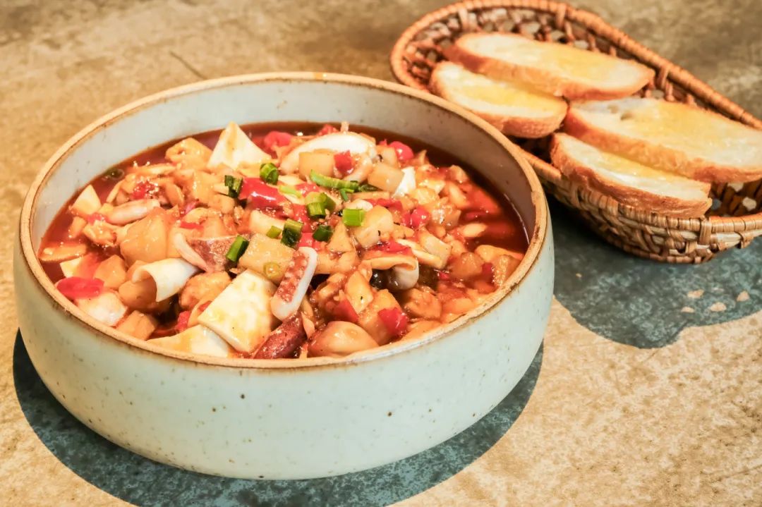 原创菜油浸三脆由黄喉鱿鱼藕丁组成,搭配面包片中西合璧,爽脆十足。