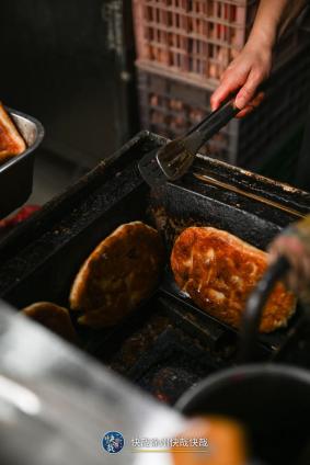 猪头肉切碎,混着大葱碎,一起包裹在面里。手工现擀的面饼,先煎后烤,所以表皮焦脆。混合着葱香,来上一口,别提多带劲儿了。
