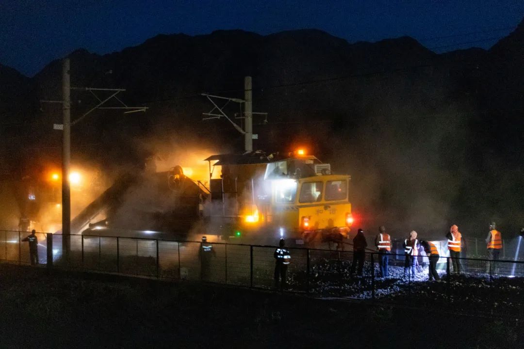 10月9日凌晨3时16分,随着道岔大机打磨施工命令正式下达,兰新铁路北河车站站内顿时机械轰鸣声响起,兰州铁路局管内兰新、陇海铁路第二阶段集中修施工全面铺开。