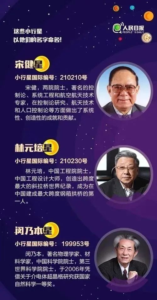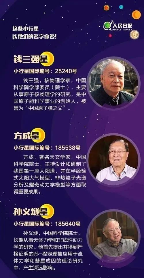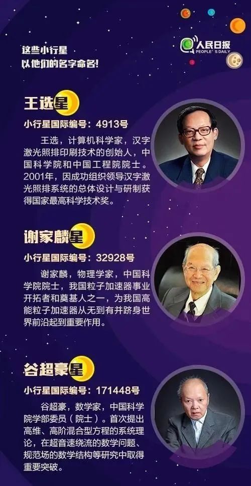 自“紫金一号”始,多年来,在浩瀚的宇宙中,有越来越多的小行星以中国科学家名字命名,在宇宙中闪耀苍穹,袁隆平星、钱学森星、南仁东星......这些科学家们追求真理,科技报国,他们的科学精神代代相传,薪火永继。