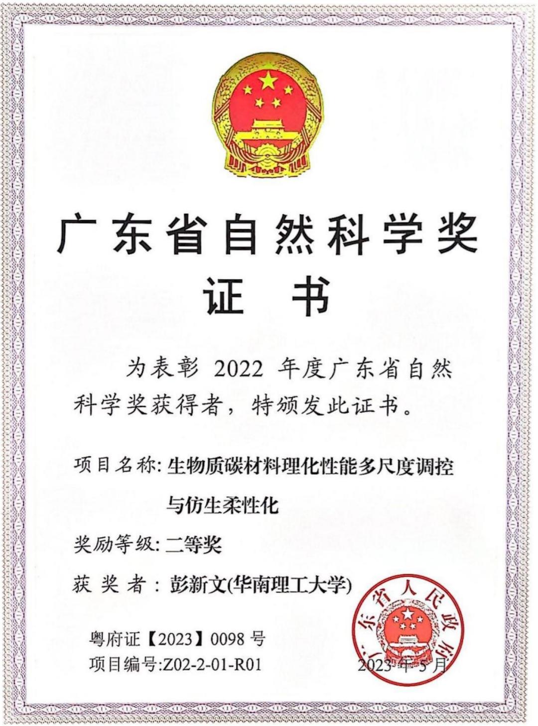 在广州市科技菁英“领航”计划项目的支持下,彭新文团队在生物质高值转化、生物质碳电极、生物质凝胶固态电解质、纸基电池隔膜的设计与制备、结构与性能调控等方面开展了基础性、前瞻性和系统性的创新科学研究和交叉学科前沿探索,围绕木质纤维素分子结构解聚调控与高值转化的关键科学问题,发展高效、绿色的调控技术与物质转化新方法,部分成果成功与企业合作,实现了竹(笋)生物发酵制醇、竹黄酮、绿色肥料、竹/木炭等中试生产线建立,以及相关生物质基产品的产业化。