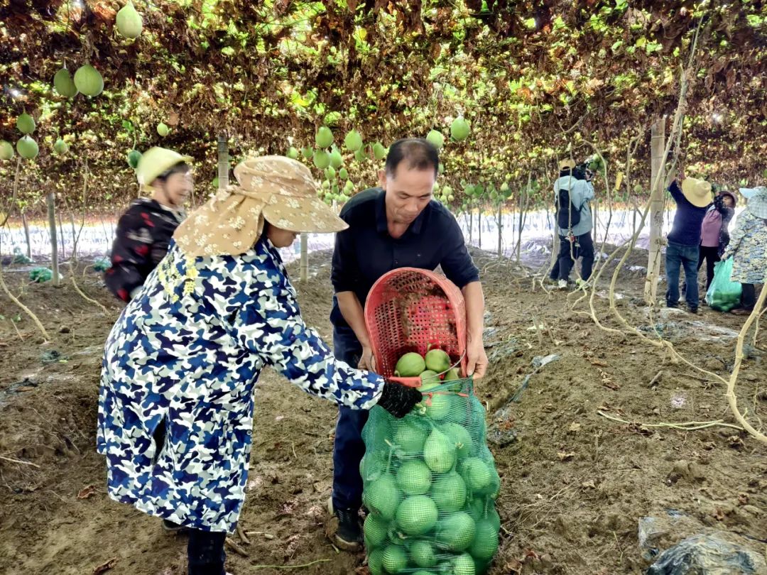 当天,在平湖村瓜蒌种植基地,30余亩的瓜蒌同样也迎来首次丰收。村干部、网格员和村民们穿梭其中,在欢声笑语中一起采收成熟的瓜蒌。他们精心挑选,手起刀落间,一个个瓜蒌被打包装袋,等待托运。看着眼前丰收的场景,在一旁笑得开心的还有提前半个月远道而来的河北客商王建秋。