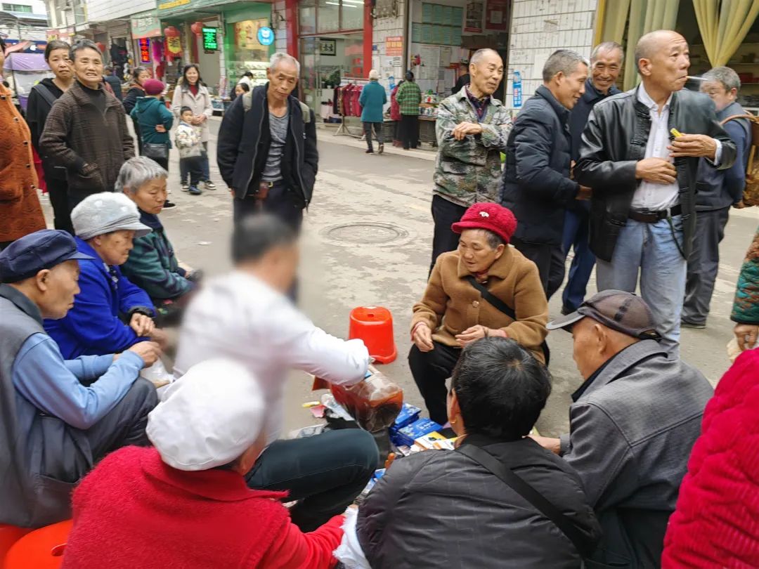 上午10时许,黄思宇一行步巡到集镇菜市场路口,路边一个售卖药材的摊点引起他的注意,摊位上摆放着瓶装药酒和若干药粉、药丸,摊位边围上来的五六个老年人正听着摊主介绍药酒的功效,不时有老人递去几十、上百元钱,买摊主的药酒。