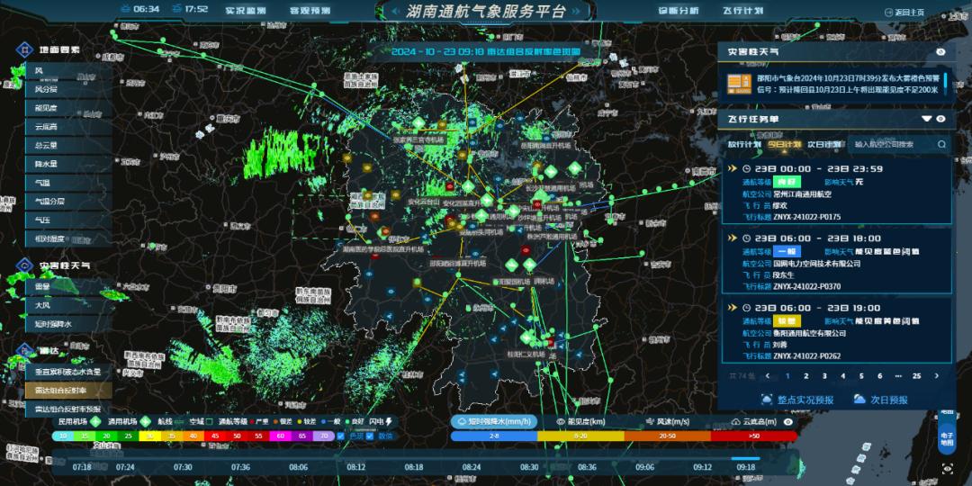 在湖南省通用航空服务中心长沙飞行服务站,省通航公司与省气象局合作研发的通航气象服务平台已接入监控指挥中心平台。省气象服务中心专业气象台副台长谢睿恒表示,依托通航气象服务平台,湖南气象及通航部门可面向应急救援、空中游览等低空飞行场景,为106家通航企业、20家机场提供服务。自2022年9月该平台投入使用以来,共服务22万余个飞行架次。今年,在湖南岳阳地区堤防决口处置中,气象部门依托该平台为54架次抢险救灾飞行提供保障,共助力运送人员49人次,物资9吨。