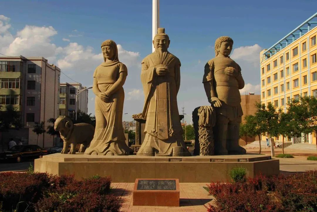 漫步河西走廊,在永昌县城南端与312国道交会处,有一座耸立在街心花园中的花岗岩的巨型雕塑:高高的基座上站着三尊花岗岩全身雕像,他们的目光深情而久远地眺望着远处的祁连山。雕像为二男一女,中间为汉代官员,左右为一男一女的古罗马人,高鼻梁、卷发,壮实的身躯、深凹的眼窝和卷曲的头发。女的身旁是一只绵羊,男的手拿稻谷,给人一种安全、祥和、丰裕之感。这便是永昌县政府1994年12月特意建造的纪念性景点——“骊靬怀古”花岗石雕。