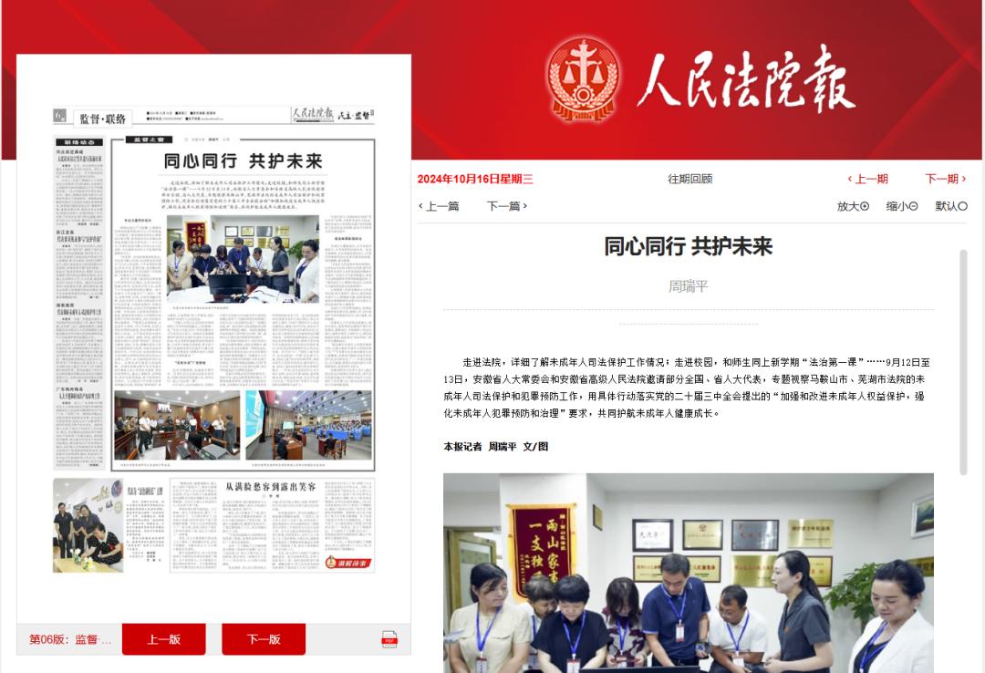 近日,《人民法院报》第六版以《同心同行 共护未来》为题,报道了安徽省人大常委会和安徽省高级人民法院邀请部分全国、省人大代表,专题视察马鞍山市、芜湖市法院的未成年人司法保护和犯罪预防工作的相关情况。