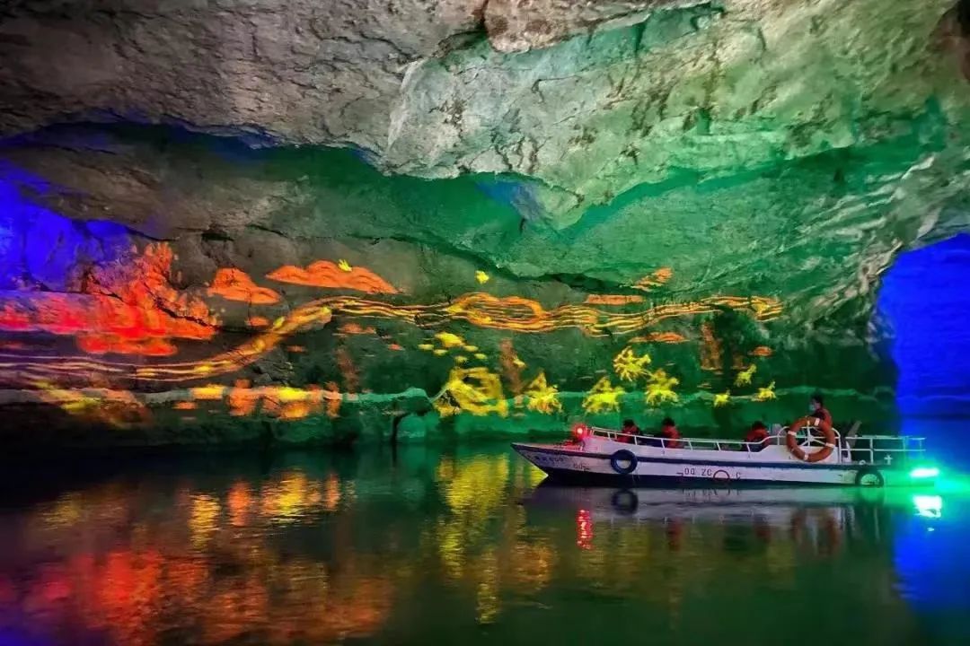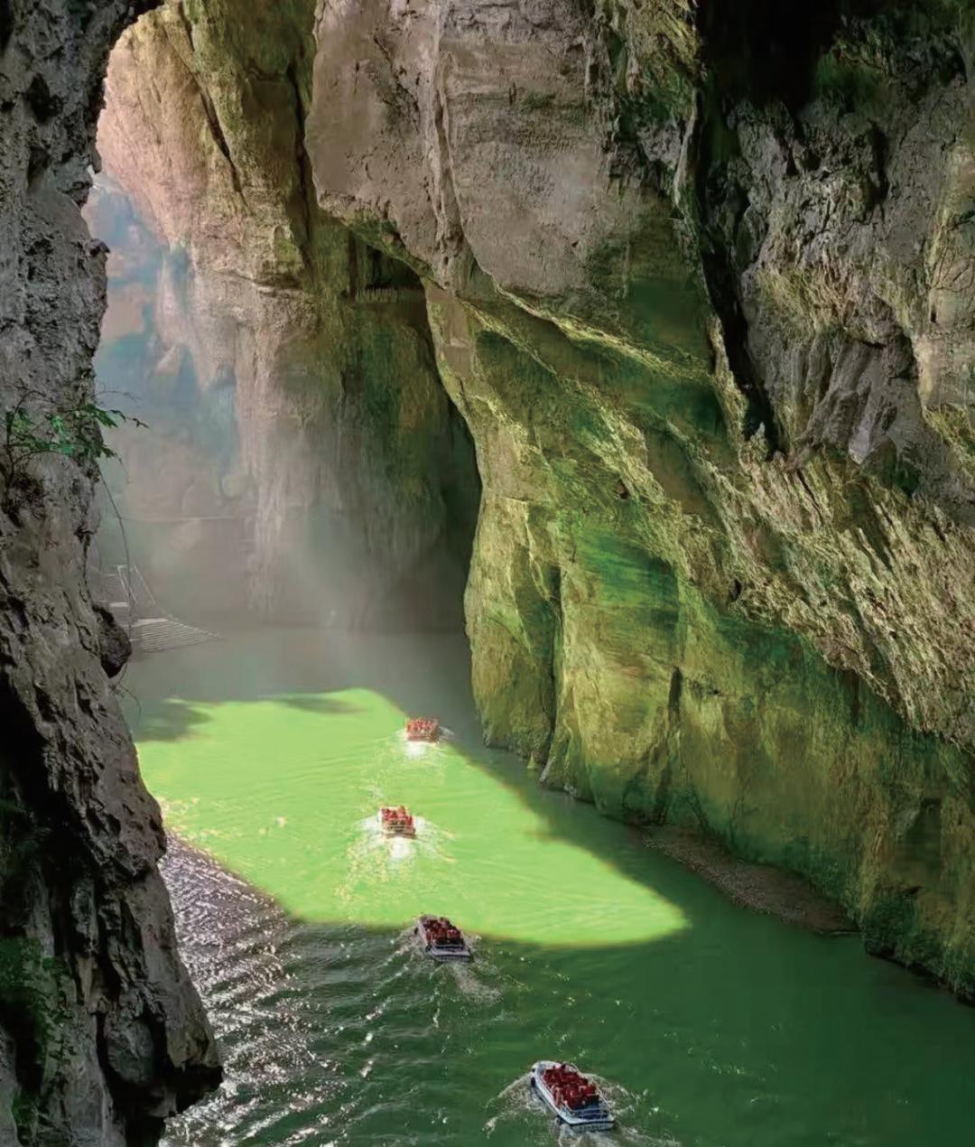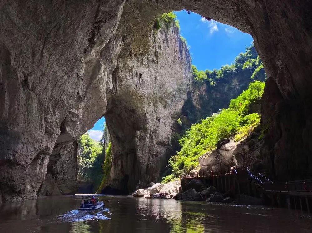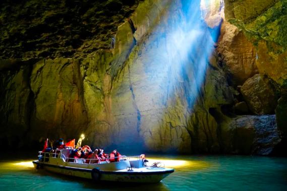 你一会儿在明亮的平湖上荡舟一览湖光山色,一会儿又遁入幽暗的水洞里感受斑驳的光影和船桨的划波声。当你的小船划至天白水碧的洞口时,天生桥构成的洞天奇景令你惊讶地屏住了呼吸:这或许是天下最密集、最瑰丽的天生桥了!每一座桥,桥身、桥墩、桥洞高宽厚长不一,但都陡峭险峻异常,你直视、侧视、仰视,洞景可谓远近高低各不同。你明明是一眼望尽了几座天生桥,待乘船划过一个个形状各异的桥洞,经过一番时明时暗、时虚时实的变幻,桥与桥之间又形成了不同的天坑,变化了不同的洞天,有的呈半圆,有的呈方形,更多却是不规则的形状,你不可能老是去琢磨一洞一天的细节,而只能在洞天组合的不断变化中去品味一种大写意的美。