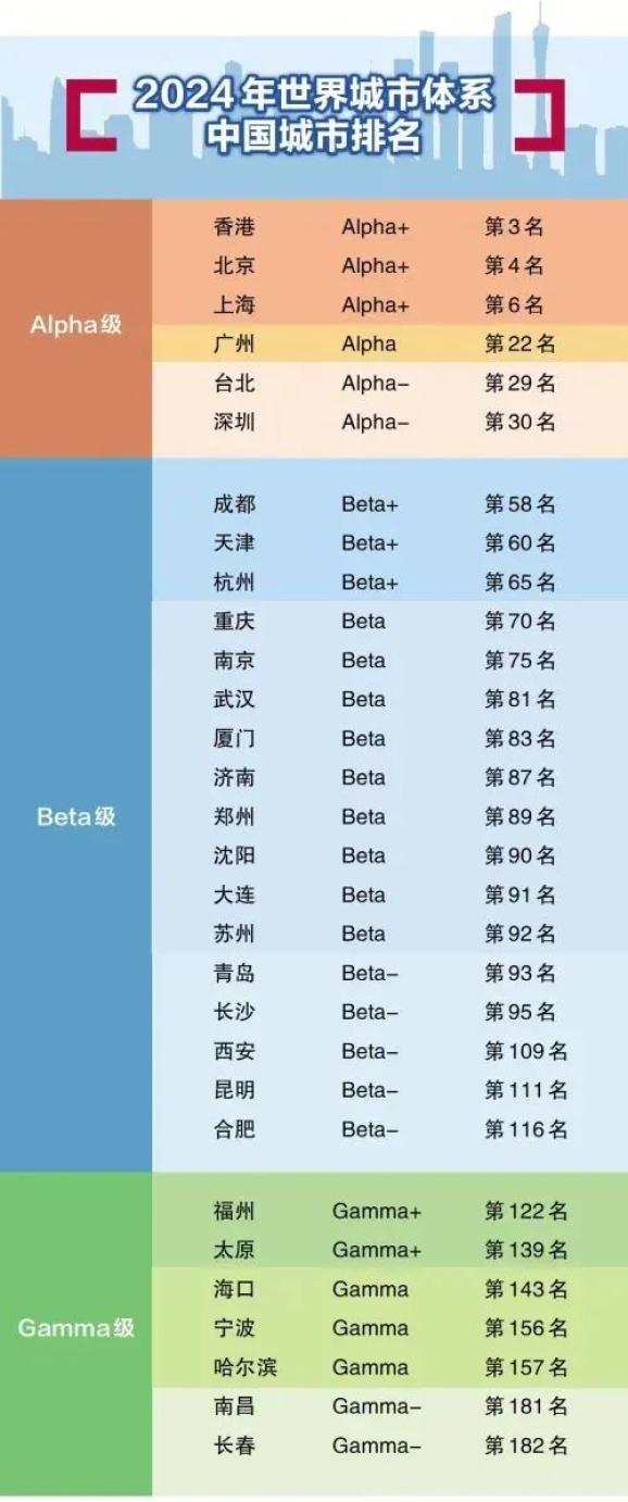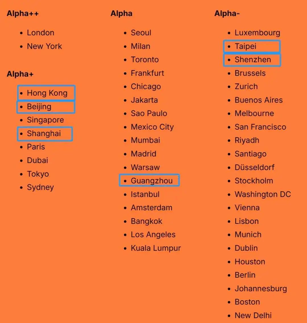 2024年的榜单中,全球300多座城市入围,中国共有40多座城市跻身其中,全球最顶尖的Alpha++级城市仍为纽约、伦敦。