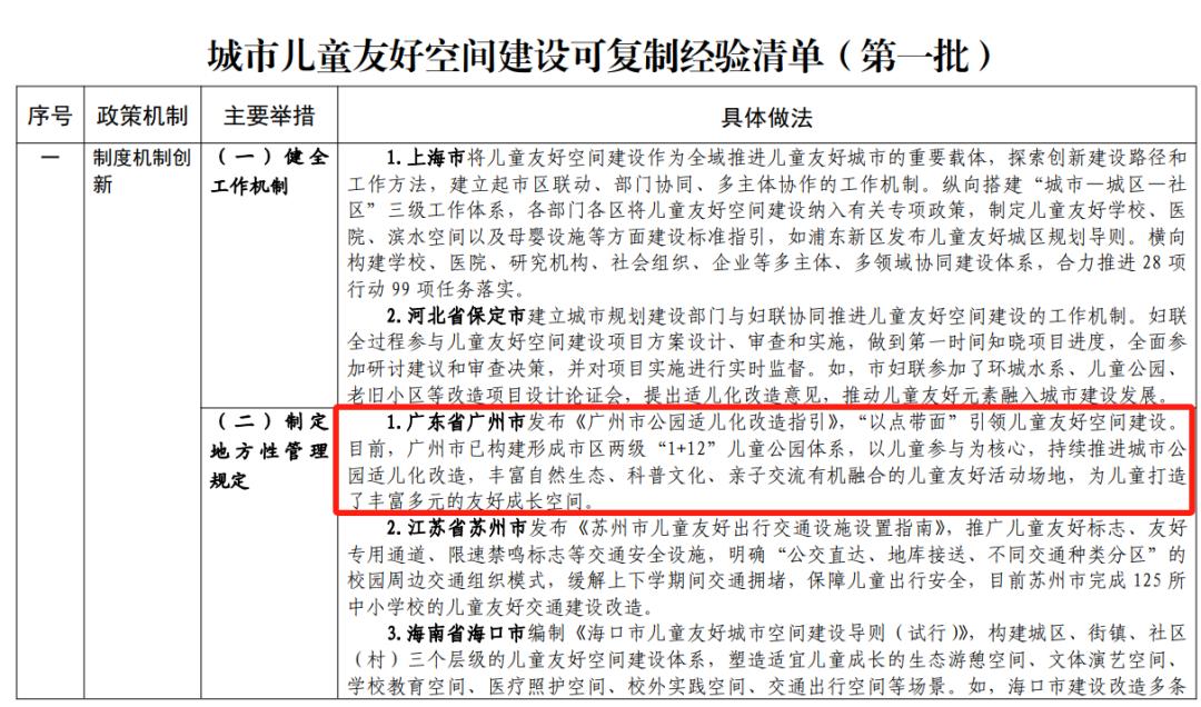 原标题:《广州上榜!3部门印发第一批城市儿童友好空间建设可复制经验清单》