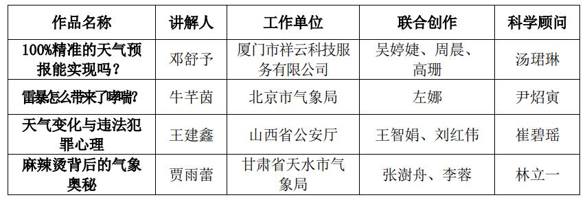 值得关注的是,除一线气象科研业务人员参赛外,还有很多科研工作者以科学顾问和联合创作等形式参与讲解作品创作,将气象科技能力现代化和社会服务现代化的最新成果转化为深入浅出、通俗易懂的科普作品,提升了气象科普创作水平。