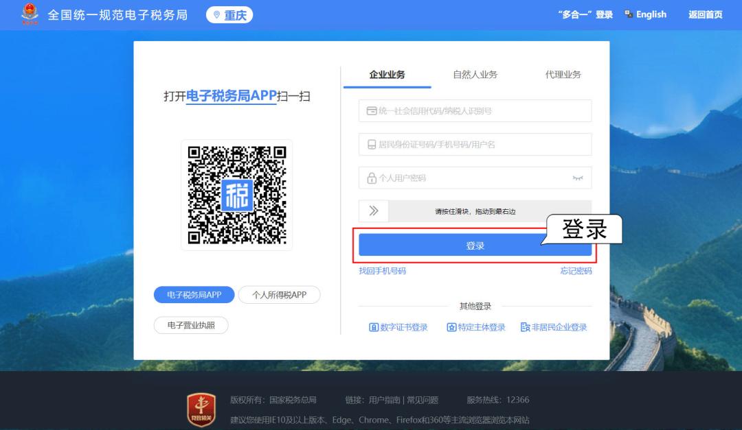 打开重庆市电子税务局官网,点击右上角【登录】,输入纳税人识别号、手机号码和密码等信息登录。