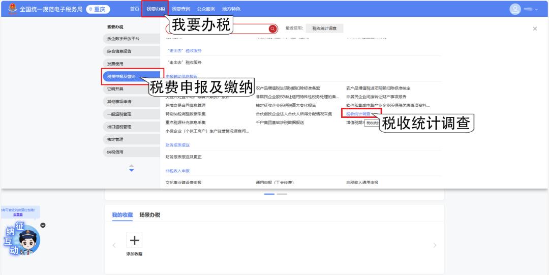登录成功后,进入新电子税局主界面,点击【我要办税】-【税费申报及缴纳】-【申报辅助信息报告】-【税收统计调查】模块,或直接搜索“税收统计调查”,打开该功能模块。