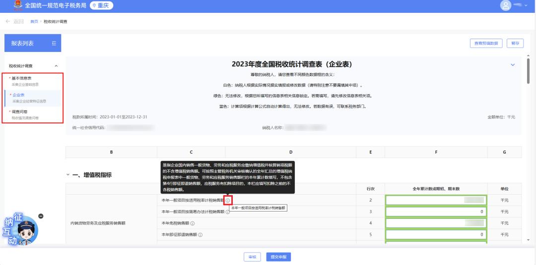 填报过程中,当光标接触到表格某一行次的“!”符号时,会出现该行次的填报说明,帮助您掌握填报口径。
