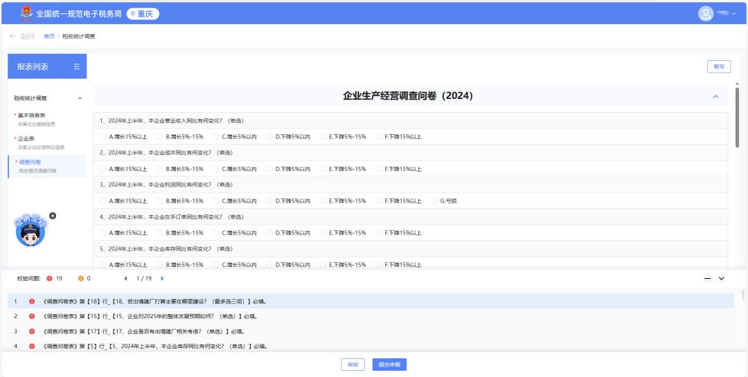 本年度统计调查报表新增“数据校验”功能,填报过程中可点击相关提示,即可展示校验不通过的栏次,一般为必填项,点击其中一行可跳转到表格中对应行次,请您补充填写。
